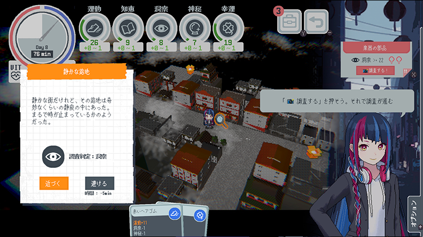 少女たちとともに神椿市を探索して、ウワサや依頼の調査を進めていきます。街を歩き回り、各地で発生しているイベントを見つけることで少しずつ調査が進みます。