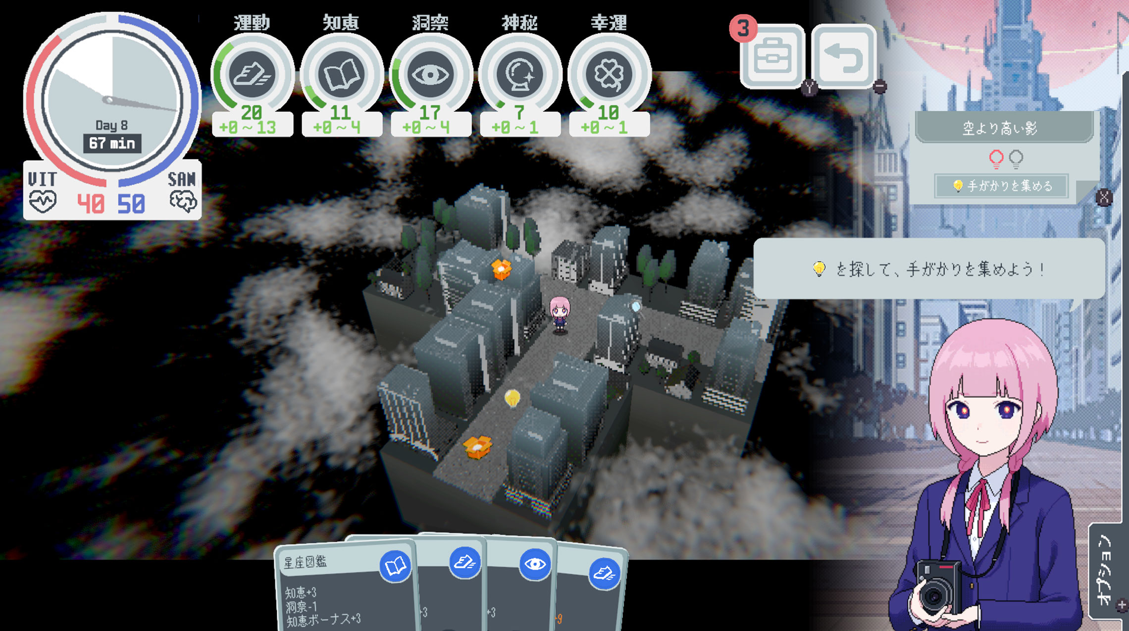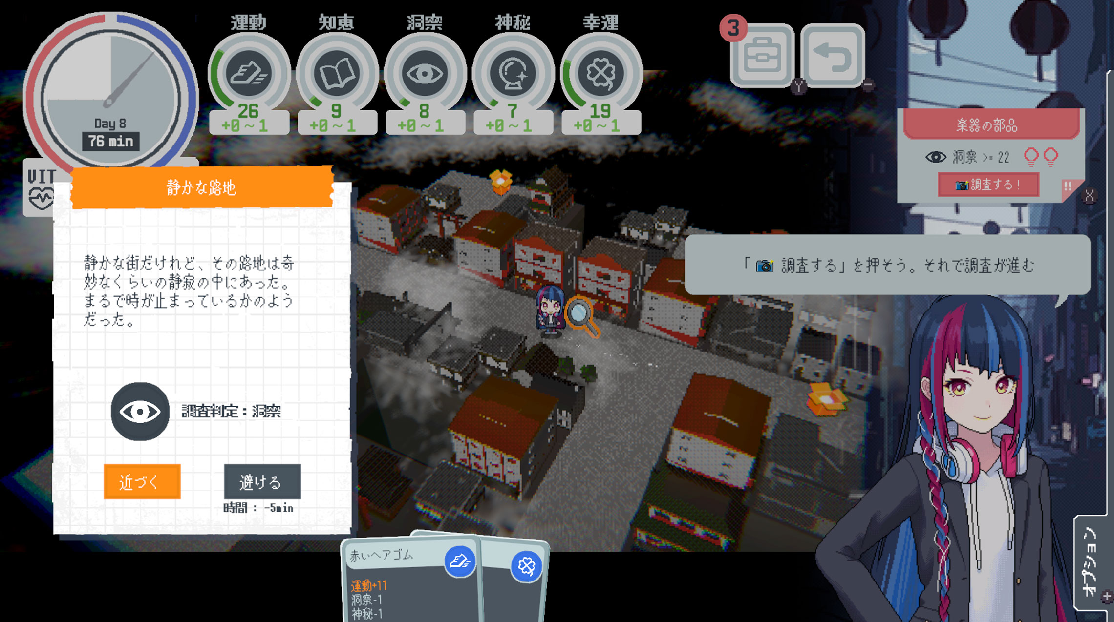 少女たちとともに神椿市を探索して、ウワサや依頼の調査を進めていきます。街を歩き回り、各地で発生しているイベントを見つけることで少しずつ調査が進みます。
