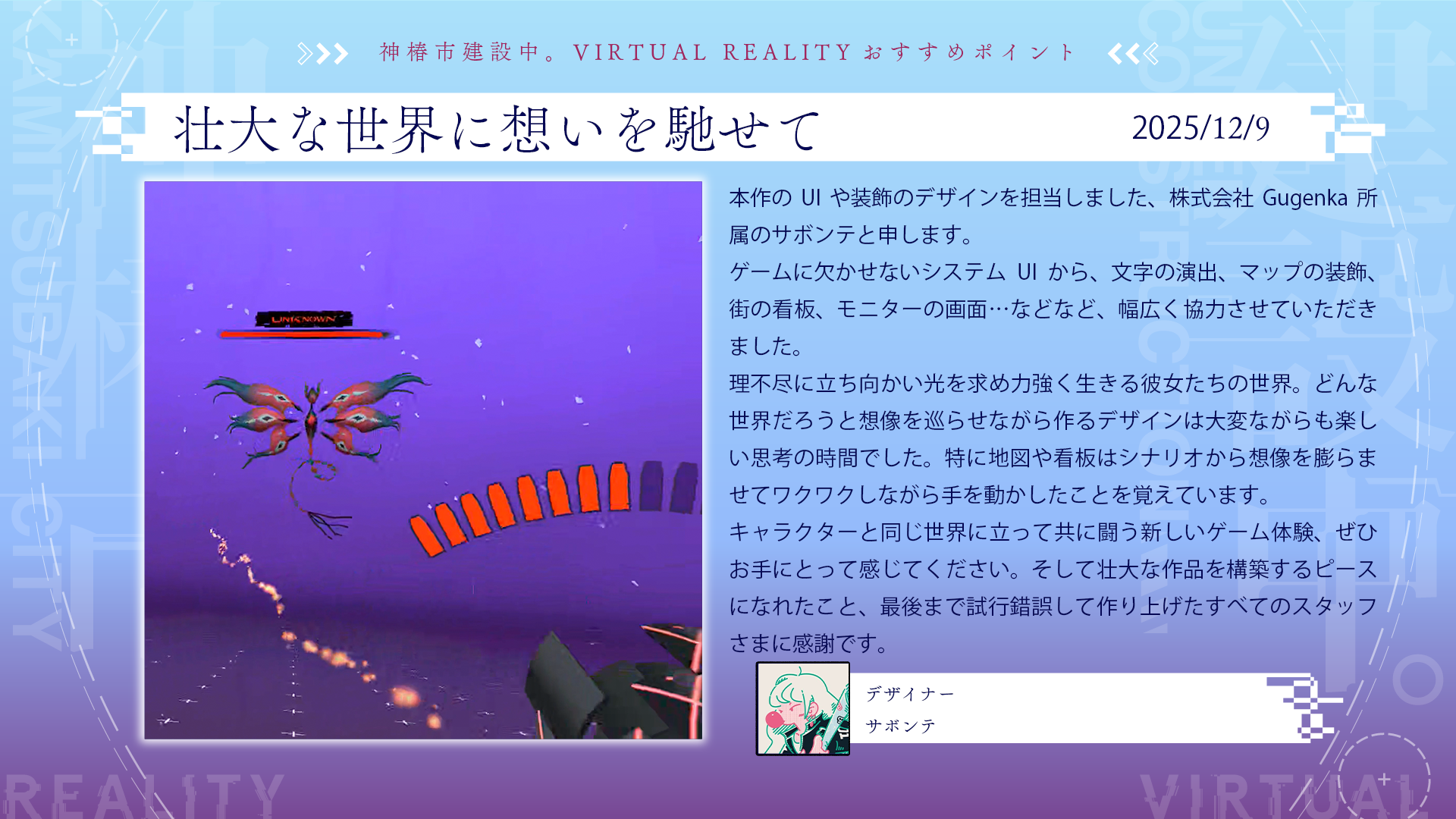 Gugenka所属 XRデザイナー。XRコンテンツの幅広いデザイン制作を手がける。Sanrio Virtual Festival 2023-2025 (World UI・Website) /涼宮ハルヒ「無敵的ハピネス」MV / 初音ミク 夜空プログラム(MV・Website・Goods) など